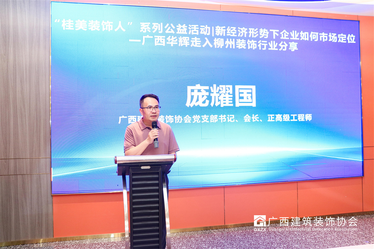 廣西建筑裝飾協(xié)會會長龐耀國在致辭中,首先對柳州建筑裝飾協(xié)會、廣西華輝裝飾集團有限公司精心配合組織本次活動表示感謝,并向到場的各位柳州市行業(yè)同仁致以誠摯問候。他指出,近年來,廣西建筑裝飾行業(yè)在綠色低碳材料應用、裝配式施工推廣,以及數(shù)字化管理與智能化設計等領域,呈現(xiàn)出加快轉(zhuǎn)型升級的趨勢。他強調(diào),面對當前經(jīng)濟環(huán)境變化和市場競爭加劇,企業(yè)必須準確把握自身定位,提升核心競爭力。